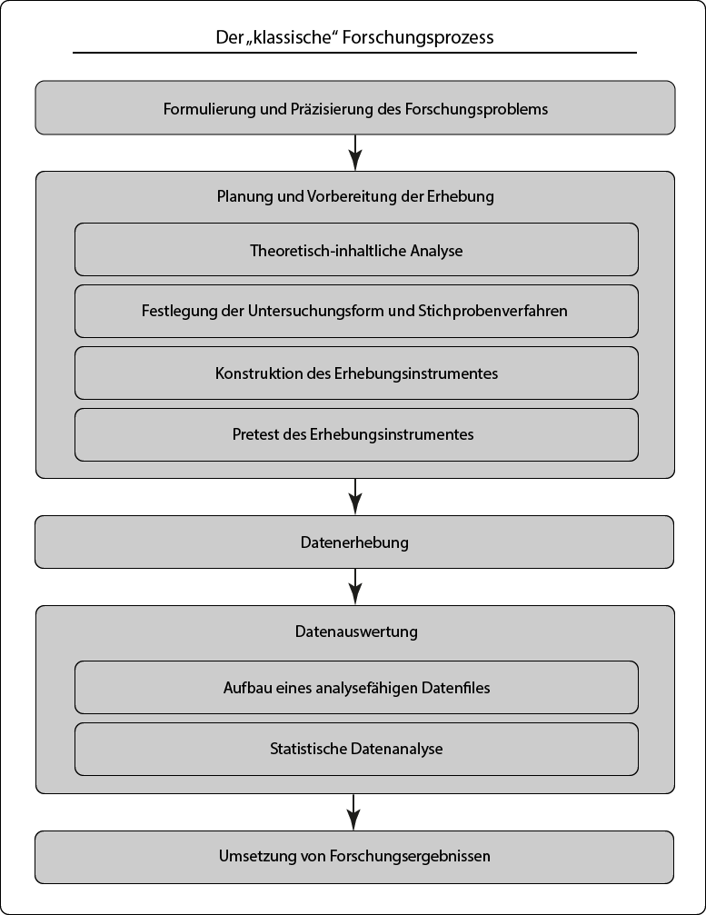 Am Anfang eines jeden Forschungsvorhabens steht das Forschungsproblem bzw. die Frage, was überhaupt untersucht werden soll. Der Entstehungszusammenhang reicht von wissenschaftlichem (oder persönlichem) Interesse, über die Auftragsvergabe (jemand möchte ein bestimmtes Phänomen beforscht haben) bis hin zu auferlegten Themensetzungen (wie bei Qualifikationsarbeiten nicht unüblich). Zur Themenfindung lassen sich aber auch Kreativtechniken (siehe etwa Jost & Richter, 2015) einsetzen, aus einem Literaturstudium können Forschungslücken bzw. zumindest erneut zu prüfende Fragestellungen abgeleitet oder in Lehrveranstaltungen behandelte Themen wieder aufgriffen werden. Letztendlich ist weniger der Ursprung der Idee entscheidend, als eine meist zu Beginn noch sehr offene Problemstellung auf eine Forschungsfrage und für quantitative Arbeiten üblich, diese zusätzlich in eine oder mehrere Hypothesen zu konkretisieren. „In der Sozialforschung ist eine Hypothese eine theoretisch begründet Aussage über den Zusammenhang zwischen zwei oder mehr Variablen, die empirisch untersucht werden soll“ (Schirmer, 2009, S. 125). Sie stellen damit ein Bindeglied zwischen Theorie und Empirie dar und lassen sich entweder rein aus Theorien ableiten (deduzieren) oder basieren auf (selbst)entwickelten und dennoch theoriegeleiteten „Mini-Theorien“ bzw. (Survey-)Modellen (Kromrey u. a., 2016, S. 96). Eine theoretische Fundierung erfährt die Arbeit zudem in der Aufbereitung des Forschungsstandes, welcher auch die Einbettung von Erkenntnissen vorangegangener empirischer Untersuchungen zum Thema enthält. Selbst bei explorativen Studien nähert man sich dem Forschungsgegenstand meist nicht theorielos an, da zumindest zu Teilaspekten bereits Annahmen in der Wissenschaft bestehen dürften. Zusammenfassend bedeutet die Entwicklung von Forschungsfragen und Hypothesen, sich in die bestehende Literatur einzuarbeiten und mit dem gewonnenen Wissen das Forschungsproblem zu präzisieren. Entsprechend ist dieser Phase ausreichend Zeit einzuräumen.