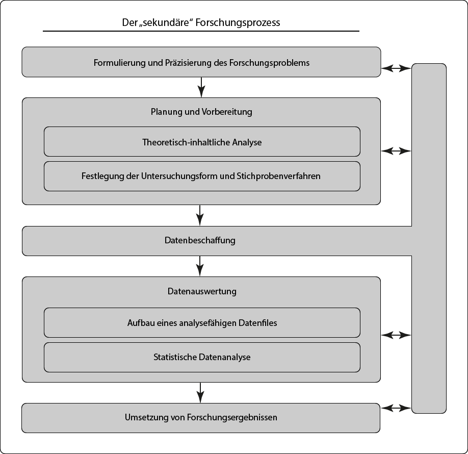 Die Forschungsfrage bzw. vor allem die Hypothesen bestimmen wesentlich die weitere Planung etwa hinsichtlich der Untersuchungsebene (Kollektiv- und/oder Individualeben), der benötigten Daten resultierend aus der Erhebungsform (Querschnitts-, Trend-, oder Panelerhebung) oder der Zielpopulation über welche Erkenntnisse gewonnen werden sollen (Diekmann, 2002, S. 194). Im Umkehrschluss bedeutet dies, dass die Entwicklung von Forschungsfrage und Hypothesen von der Verfügbarkeit der Sekundärdaten gerahmt wird. Neben dem Literaturstudium gilt es daher, bereits potentielle Sekundärdatensätze zu eruieren. Je nach Themenfeld können sich mehrere Datensätze anbieten. In solch einem Fall lässt sich die Entscheidung im Sinne der bestmöglichen Passung (siehe weiter unten) später treffen. Auf der anderen Seite kann die Datenlage so begrenzt sein, dass sich gewisse Forschungsfragen nicht adäquat beantworten lassen. In solch einem Fall könnte etwa die Abkehr von einer Längsschnittbetrachtung hin zu einer Querschnittsbetrachtung oder die Ausweitung der Untersuchungspopulation (anstatt ältere Menschen aus Wien zu beforschen, werden nun ältere Menschen aus Österreich in den Blick genommen) zur Ausdehnung des Samples eine mögliche Konsequenz sein. Mit Sekundärdaten zu arbeiten bedeutet, wissenschaftlich vertretbare Kompromisse zu finden, welche sich bereits in der Formulierung der Forschungsfrage bzw. Hypothesen äußert.