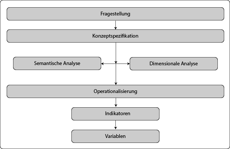 Mit der Formulierung der Forschungsfrage und Hypothesen gelangt man zu der Frage, was gemessen bzw. analysiert werden soll. Forschungsfrage bzw. Hypothesen enthalten theoretische Konzepte/Konstrukte bzw. Begriffe, die „mit der beobachtbaren Erfahrungswirklichkeit verknüpft werden müssen“ (Döring & Bortz, 2016, S. 222). Solche, als komplex zu bezeichnende Begriffe wie etwa Arbeitszufriedenheit oder Lebensqualität mögen im alltäglichen Gebrauch als unmissverständlich angesehen werden. Reflektiert man diese, wird die diffuse Beschaffenheit schnell bewusst. Sind es das Einkommen, die Gesundheit oder der verfügbare Wohnraum, welche Lebensqualität neben vielen weiteren Dimensionen konstituieren bzw. damit in Zusammenhang stehen? Geht es um die subjektive Bewertung der eigenen Lebensumstände oder eher um objektivierte Faktoren? Soll unter Einkommen der Brutto- oder Nettobetrag, abzüglich Alimentation und zuzüglich von monetären Sozialtransfers definiert sein und was ist unter Gesundheit genau zu verstehen? Zur Beantwortung dieser Fragen wird eine theoretisch-inhaltliche Analyse durchgeführt, womit man zur Konzeptspezifikation und anschließend der Operationalisierung gelangt (siehe auch Paier, 2010). Beide Begriffe werden in der Literatur nicht immer getrennt behandelt bzw. umgekehrt, in manchen Fällen gar synonym gebraucht. Richtig ist, dass sich beide Schritte aufeinander beziehen, trotzdem ist es sinnvoll, diese gedanklich voneinander zu trennen (siehe Abbildung 3).