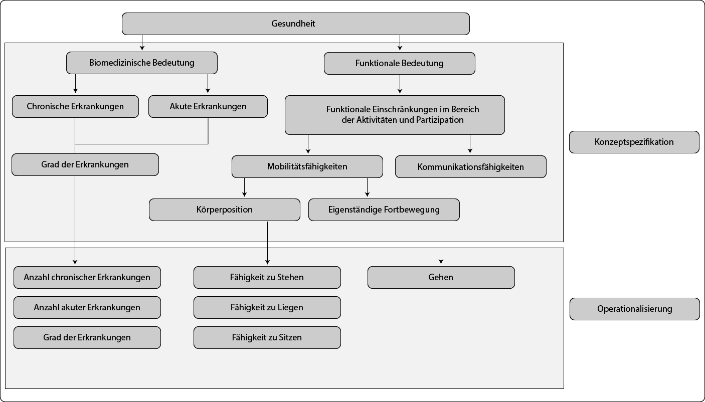 Nochmals sei betont, dass viele Dimensionen und mögliche Indikatoren in diesem Beispiel (Abbildung 4) nicht berücksichtigt wurden; je umfangreicher solch eine Systematisierung ausfällt, umso leichter ist es, die am besten realisierbaren Dimensionen und Indikatoren auszuwählen. Die Visualisierung hilft zudem Zusammenhänge zu entdecken, welche sich wiederum in Hypothesen formulieren lassen – auch wenn diese nicht in der Arbeit geprüft werden, so sind sie Teil der theoretischen Argumentation. Unschwer lässt sich erkennen, dass die Anzahl und der Grad von Erkrankungen im Zusammenhang mit der Mobilitätsfähigkeit stehen dürfte. In einer Hypothese formuliert: „Je mehr chronische und akute Erkrankungen eine Person hat, desto geringer ist ihre körperliche Mobilität“ und „Je höher der Grad an Erkrankungen, desto geringer ist die körperliche Mobilität“. Führt man den Gedanken noch etwas aus, so liegt der logische Schluss nahe, dass dies nicht die einzigen Faktoren sein werden, welche auf die körperliche Mobilität einen Einfluss haben. Bspw. persönliche Bewältigungsstrategien, Hilfsmittel oder das persönliche Schmerzempfinden dürften ebenso auf die Mobilitätsfähigkeiten einwirken. Eine perfekte Korrelation ist a priori unwahrscheinlich, interessant ist aber die Frage, wie stark der Zusammenhang trotz dieser Vernachlässigungen ausfällt.