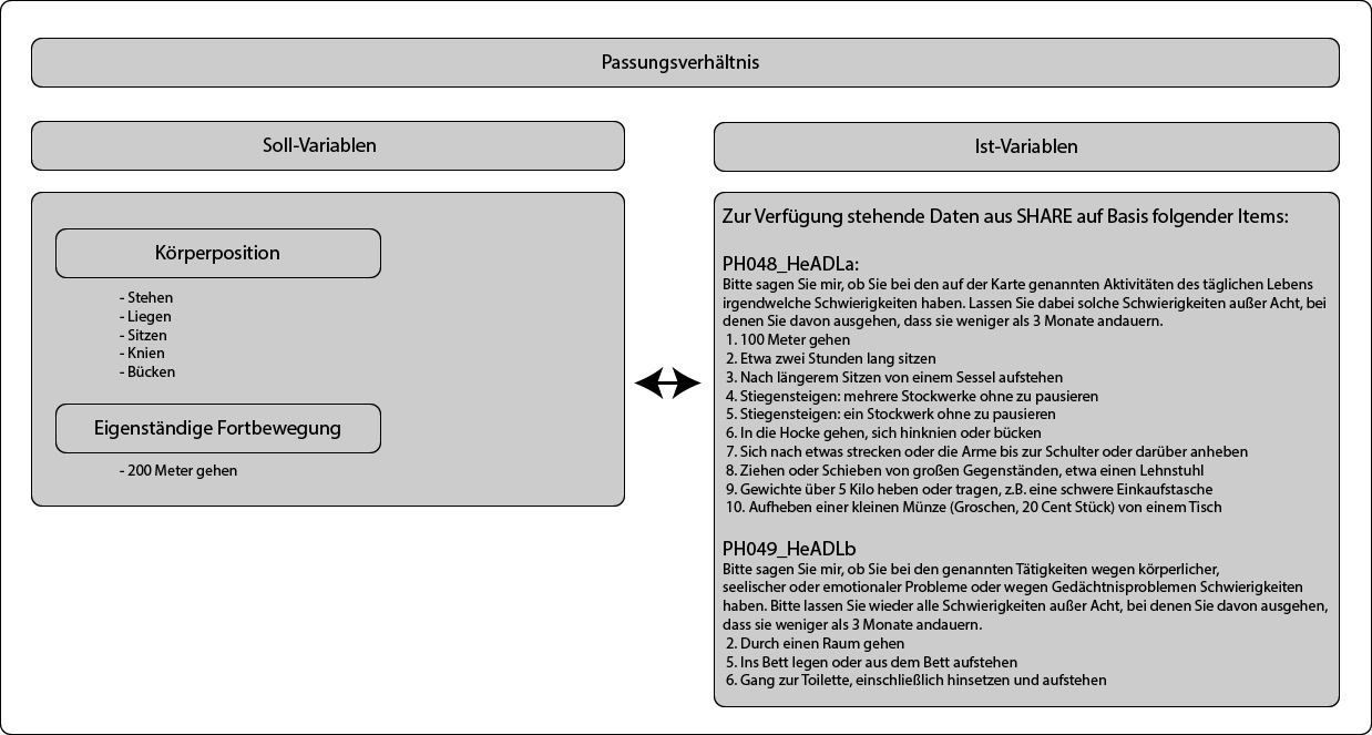 Abbildung 5 stellt die Ist-Variablen aus SHARE den Soll-Variablen zur körperlichen Mobilität gegenüber.